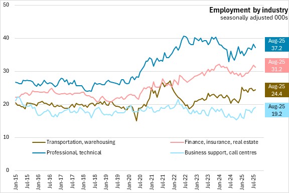 Compared to August 2024, there were employment gains for private sector workers (+1,500, +0.5%), and self-employment (+5,800, +11.5%), while public sector employment declined (-2,900, -2.1%).