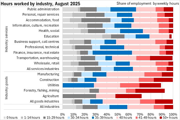 Compared to the provincial average, a larger share of workers in goods producing industries and transportation/warehousing worked more than 40 hours per week in August 2025.