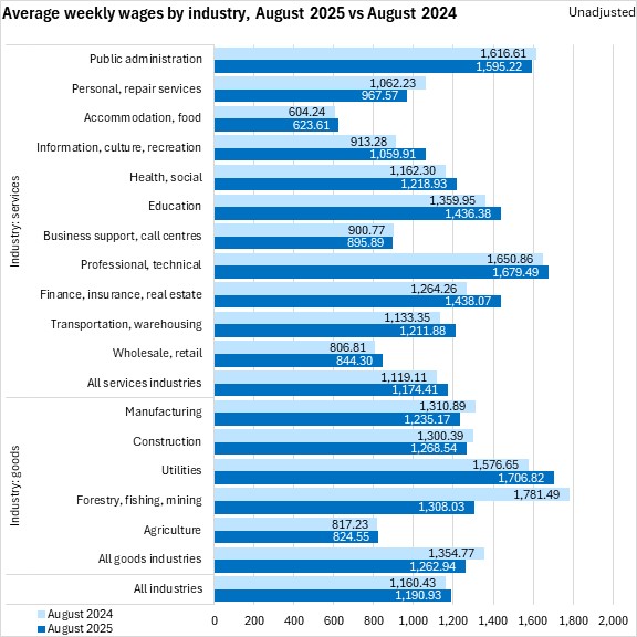 Average weekly earnings across all employees were $1,190.93 in August 2025. The highest average weekly earnings (both full and part time employees) were reported in utilities, professional/technical services, and public administration. The lowest average weekly earnings were in accommodation/food services and agriculture.