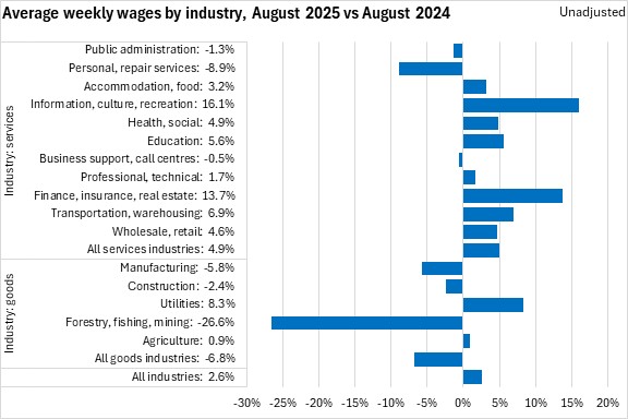 Average weekly earnings increased by 2.6% from August 2024 to August 2025. The fastest gains in average weekly earnings were in information/culture/recreation and finance/insurance/real estate, followed by transportation/warehousing, education, health care/social assistance and wholesale/retail. The largest declines in average weekly wages were in forestry/fishing/mining, followed by personal/repair services.