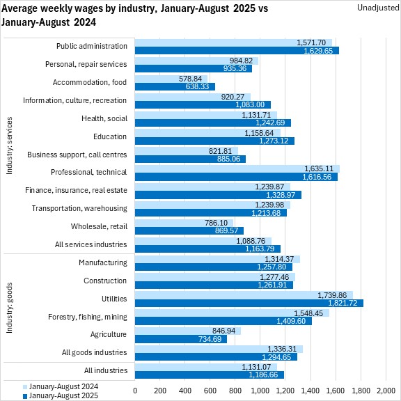 Average weekly earnings in the first seven months of 2025 were highest in utilities, public administration, and professional/technical services. The lowest average weekly earnings were in accommodation/food services, and agriculture in January-August 2025.