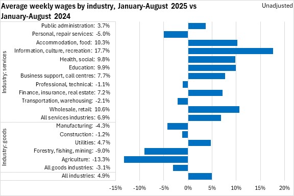 Average weekly earnings increased 4.9% in the first eight months of 2025 compared to the same period of 2024. The fastest gains in average weekly earnings were in information/culture/recreation, wholesale/retail, and accommodation/food services. Agriculture and forestry/fishing/mining reported the fastest declines in average weekly earnings in January-August 2025.