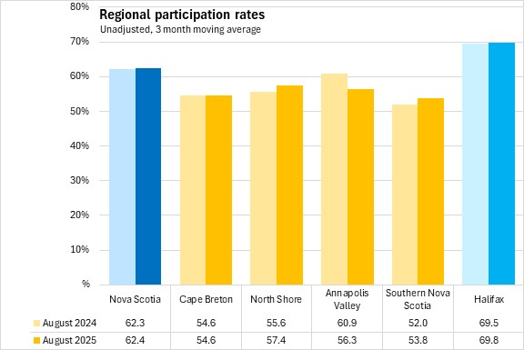 Halifax & East Hant's participation rate was 68.3% in the seasonally adjusted August 2025 three month moving average, while participation rates were 54.7% across the rest of the province.