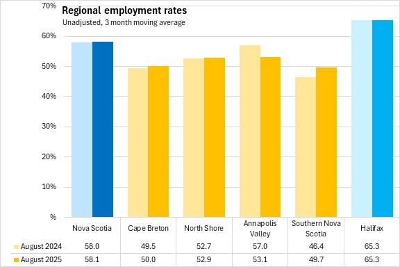 Halifax & East Hants reported an employment rate of 64.4% in the seasonally adjusted August 2025 three month moving average, while the employment rate was 50.4% outside the city.