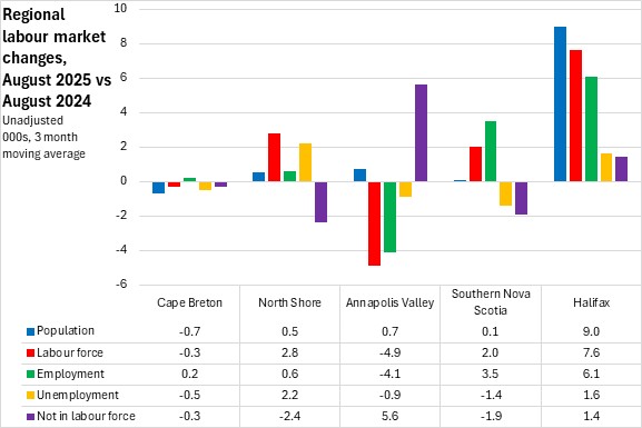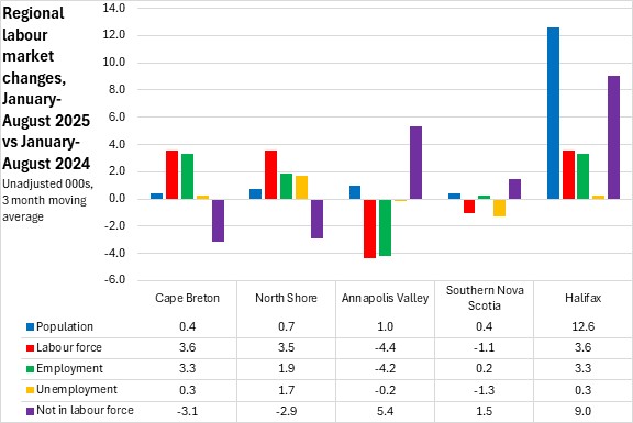 Compared with January-August 2024, labour force and employment increases were concentrated in Cape Breton, the North Shore, and Halifax, all of which reported stronger growth in labour force than employment, resulting in higher unemployment. Lower labour force and employment in the Annapolis Valley resulted in more people not in the labour force. Southern Nova Scotia reported a higher employment on a smaller labour force, resulting in fewer unemployed and a higher number of persons not in the labour force. Halifax saw the strongest population growth, and a large increase in the number of people not in the labour force.