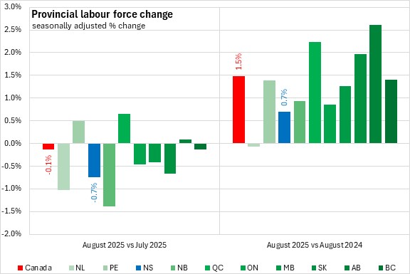 Canada's labour force was down 0.1% from July with seven provinces reporting declines in August 2025. The fastest growth was in Québec, while the fastest decline was in New Brunswick.