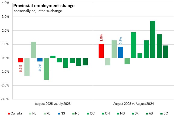 Canada's employment decreased by 0.3% in August 2025. Eight provinces reported lower employment in August led by New Brunswick. Only Prince Edward Island and Québec reported growth in August.