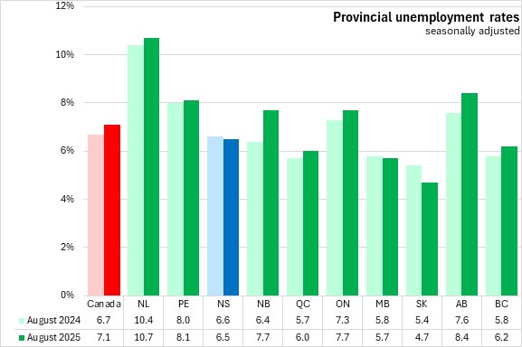 The national unemployment rate was 7.1% in August 2025, up from 6.7% in August 2024. Saskatchewan had the lowest unemployment rate while Newfoundland and Labrador reported the highest unemployment rate in August 2025.