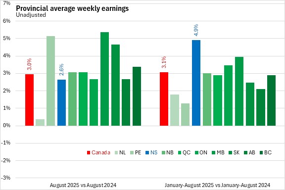 Comparing January-August 2025 with the same months in 2024, Nova Scotia's average weekly earnings were up 4.9% - fastest among provinces. National average weekly earnings were up 3.1% year-to-date with the slowest growth in Prince Edward Island.