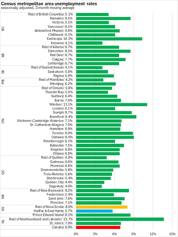 The Halifax & East Hants unemployment rate was 5.7% in the seasonally adjusted August 2025 three month moving average. Outside of Halifax & East Hants the unemployment rate was 8.0%. In central and western provinces, unemployment rates in Census Metropolitan Areas are similar to or higher than unemployment rates outside CMAs. In the Atlantic Provinces unemployment rates are typically higher outside CMAs.