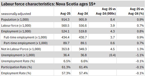 Compared with August 2024, Nova Scotia's population over the age of 15 increased by 8,400 (+0.9%), while the labour force increased 3,900 (+0.7%), and employment increased by 4,300 (+0.8%). Compared to August 2024, unemployment rate, participation rate, and employment rate were all lower by 0.1 percentage point.