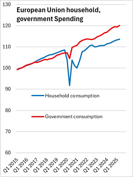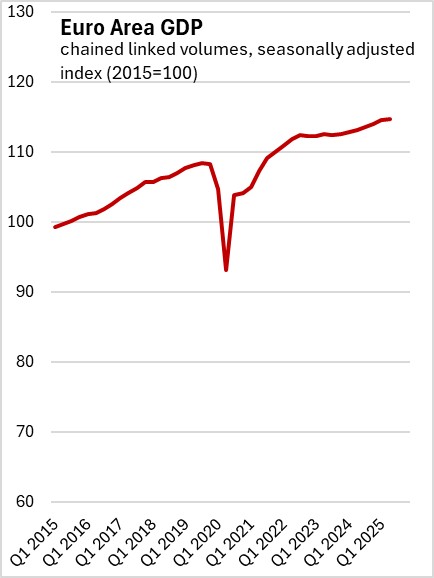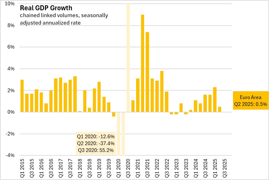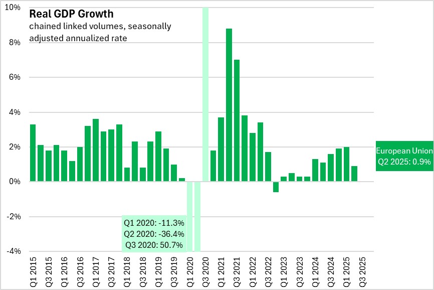 In the third GDP estimate for Q2 2025, the seasonally adjusted annualized growth rate for real GDP was 0.9% for the European Union and 0.5% for the Euro Area (a subset of 20 of the 27 nations of the European Union).