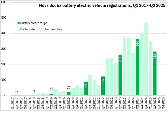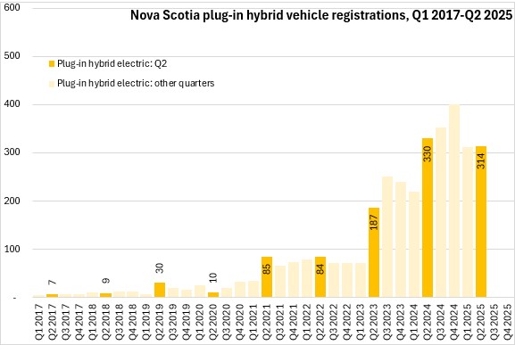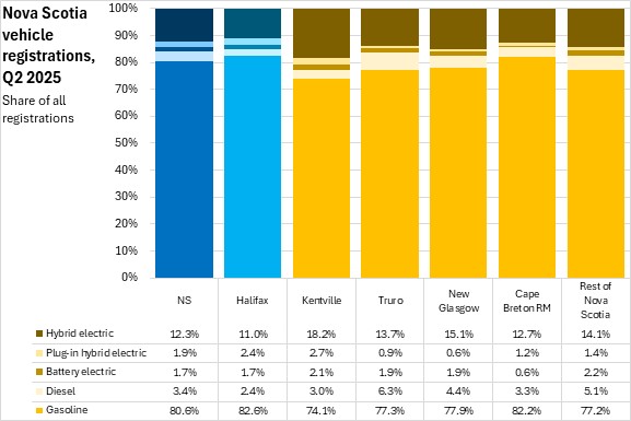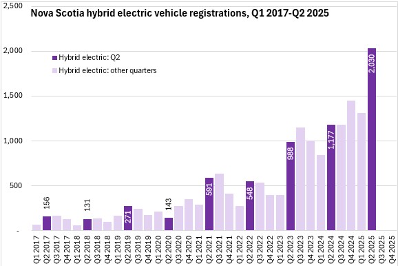 Hybrid electric vehicle registrations have risen sharply in the last two years - making them the second most common type vehicle propulsion registered in Nova Scotia in Q2 2025.