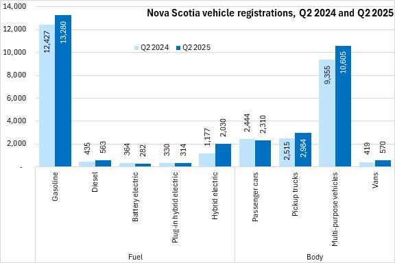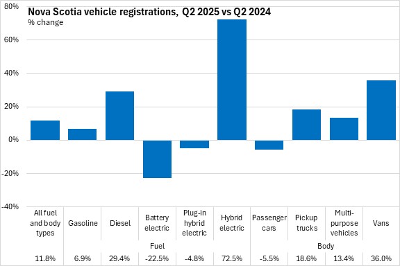 Registrations were up the most for hybrid-fuelled vehicles (+72.5%) in Q2 2025 while battery electric (-22.5%) and plug-in hybrid vehicles (-4.8%) reported lower registrations than in Q2 2024. Among body types, registrations were up most for vans (+36.0% - though this started from a relatively low value). Only passenger cars (-5.5%) reported declining registrations in Nova Scotia from Q2 2024 to Q2 2025.