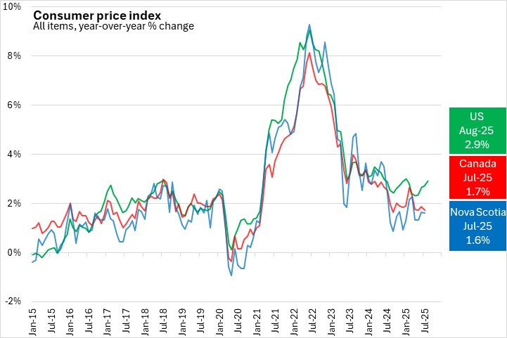 Sources: Statistics Canada. Table 18-10-0004-01 Consumer Price Index, monthly, not seasonally adjusted; U.S. Bureau of Labour Statistics retrieved from the Federal Reserve Bank of St. Louis