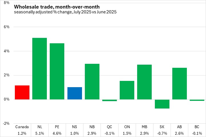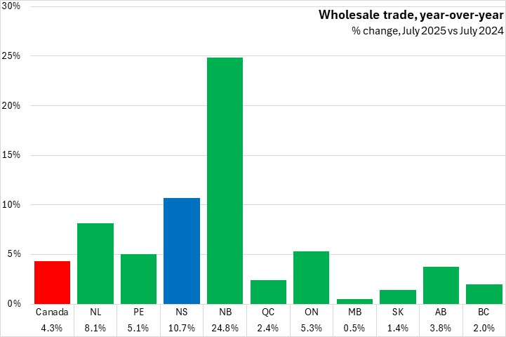 Nova Scotia wholesale trade grew 10.7% in July when compared with the same month last year. Canada's wholesale trade grew 4.3%, year-over-year. All provinces reported year-over-year increases in wholesale trade. New Brunswick reported the fastest year-over-year rise (followed by Nova Scotia), while Manitoba had the slowest increase.