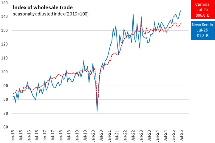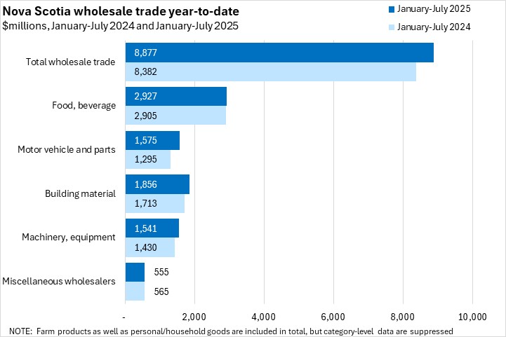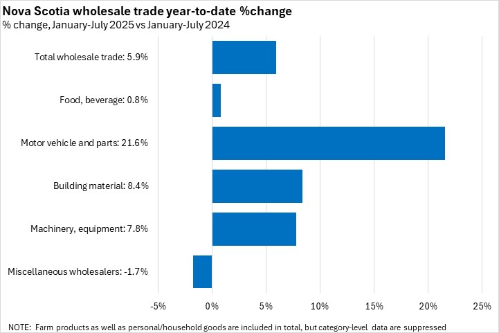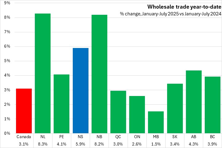 Nova Scotia wholesale trade increased 5.9% in the first seven months of 2025 compared to the same period of 2024. Canada's wholesale trade increased 3.1%. All provinces reported year-to-date increases in wholesale trade. Newfoundland and Labrador and New Brunswick reported the fastest gains, while Manitoba had the slowest.