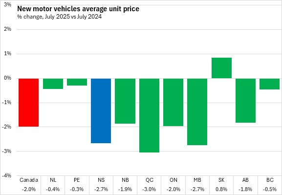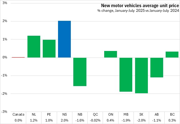 Compared to July 2024, average unit prices were down 2.7% in Nova Scotia in July 2025, the second fastest decline (tied with Manitoba) among provinces. Average unit prices were down 2.0% nationally with declines in all provinces except Saskatchewan. Québec had the steepest year-over-year decline in average motor vehicle prices.