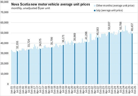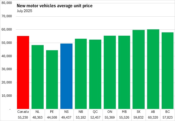 The average price of a new vehicle in July 2025 was $49,437 in Nova Scotia - third lowest among provinces ahead of Prince Edward Island and Newfoundland and Labrador. Nationally, the average price of a new vehicle was $55,230 in July with the highest value in Alberta.