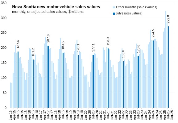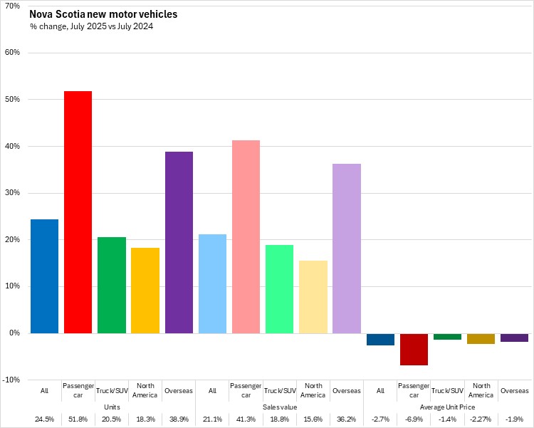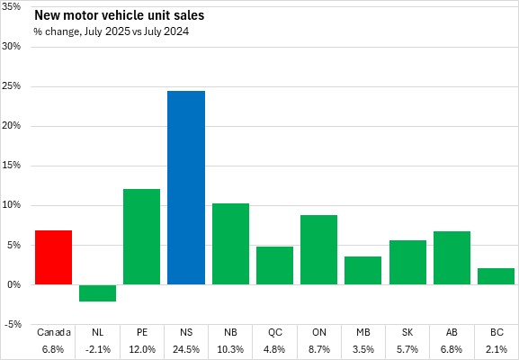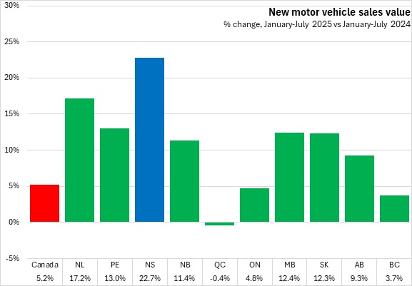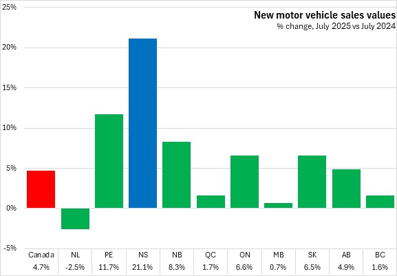 The sales values of new vehicles increased 21.1% in Nova Scotia from July 2024 to July 2025, the largest gain among provinces. National sales values were up 4.7% with gains in all provinces except Newfoundland and Labrador.