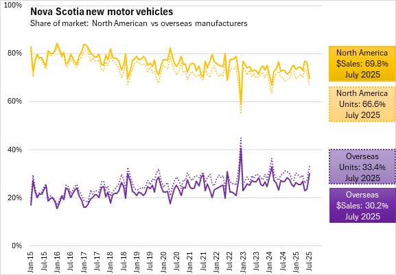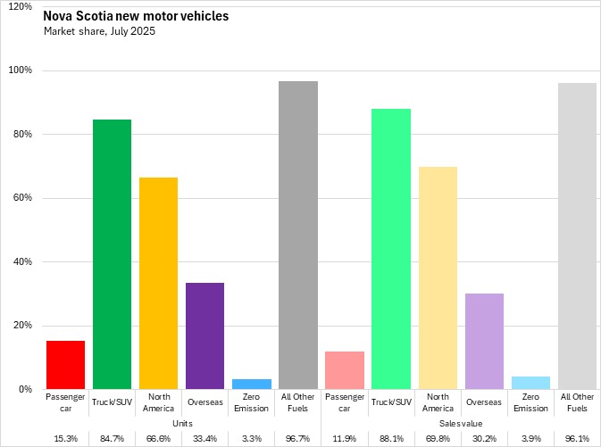In July 2025, trucks/SUVs accounted for 84.7% of unit sales and 88.1% of sales values. North American manufacturers accounted for 66.6% of Nova Scotia's unit sales and 69.8% of sales values in July 2025. Zero emission vehicles made up 3.3% of unit sales, and 3.9% of sales values, while all other fuel types accounted for 96.7% of unit sales and 96.1% of sales values.