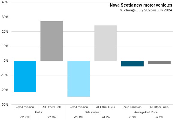 Zero emission vehicle unit sales were down 21.6% in July 2025 compared with July 2024, while sales values declined 24.6% and average unit prices decreased 3.9%. The low overall number of zero emission vehicles sold in Nova Scotia (182 in July 2025) can lead to volatility in unit sales, sales values, and prices. Other fuel type vehicles, which account for the majority of vehicles sold, saw unit sales increase 27.0% while sales values increased 24.2%, and the average unit price for other fuel type vehicles declined 2.2%.