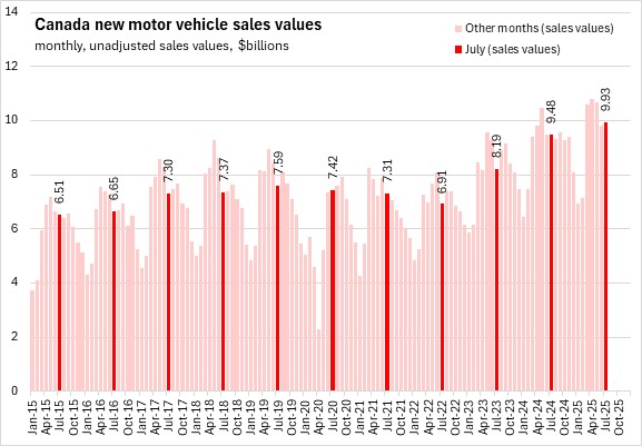 Increased unit sales have resulted in July 2025 motor vehicle sales values well above comparable months in previous years.