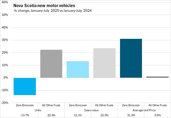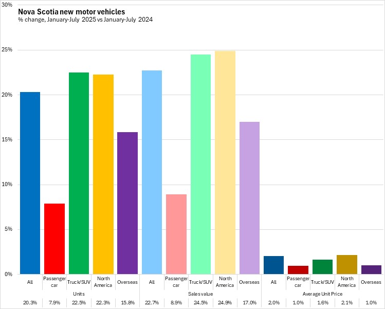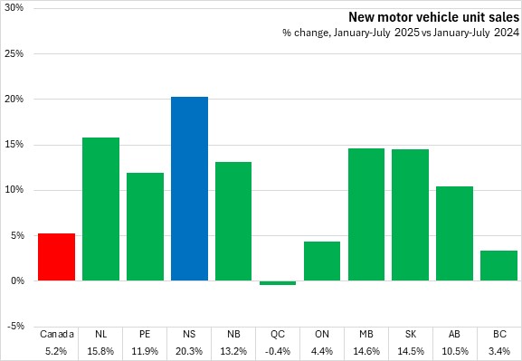 The sales values of new vehicles increased 22.7% in Nova Scotia from January-July 2024 to January-July 2025, the fastest gain among provinces. National sales values were up 5.2% with gains in all provinces except Québec.