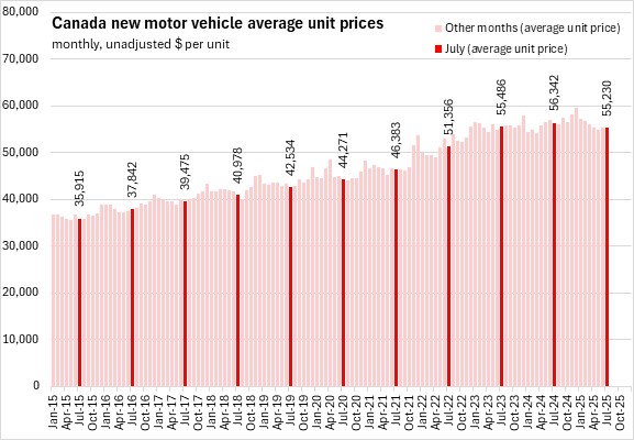 Starting with the January 2024 reference month, new data has been released on vehicle sales by fuel type. Zero emission vehicle unit sales were down 13.7% in January-July 2025 compared with January-July 2024, while sales values increased 13.1% owing to a 31.0% rise in average unit prices. Other fuel type vehicles, which account for the majority of vehicles sold, saw unit sales increase 22.4% while sales values increased 23.5%, with average unit price for other fuel type vehicles up 0.9%.