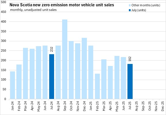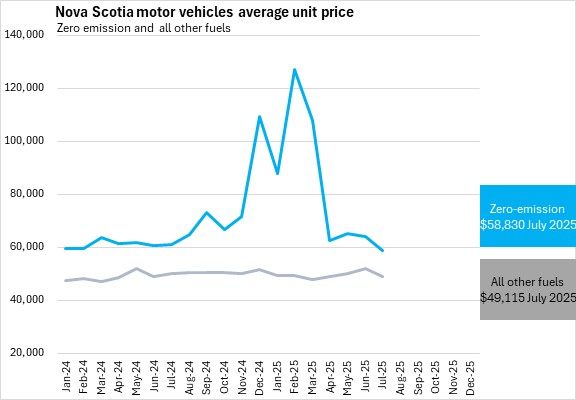 Average prices for zero-emission vehicles rose sharply in late 2024 before returning to previous averages in the spring of 2025. The low overall number of zero emission vehicles sold in Nova Scotia (182 in July 2025) can lead to volatility in prices.