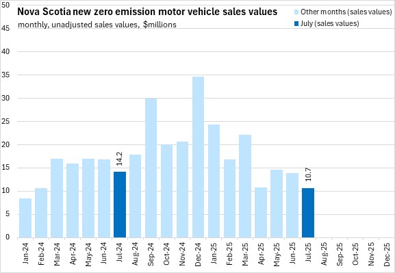Zero-emission vehicles are currently a small share of the new motor vehicle market in Nova Scotia. Due to the small number of vehicles sold, there can be volatility in the year-over-year or year-to-date comparisons for unit sales, sales value and average prices. Nova Scotia zero-emission vehicle unit sales and sales values were down compared to July 2024.