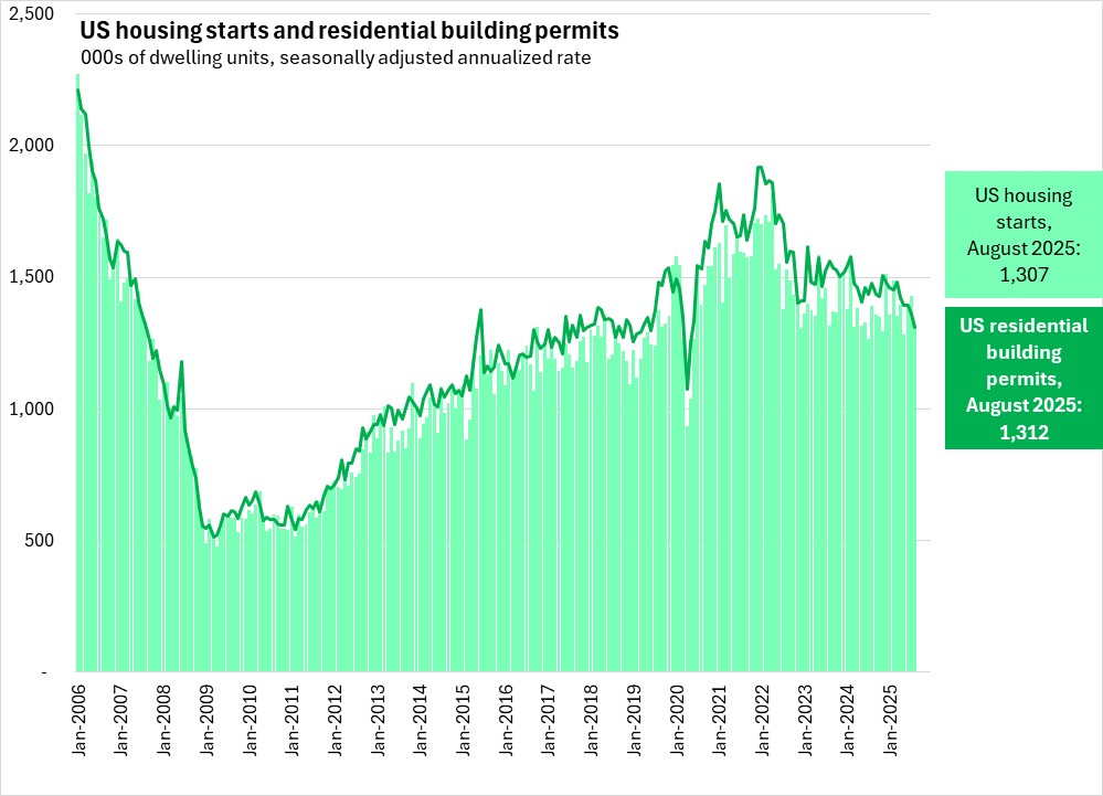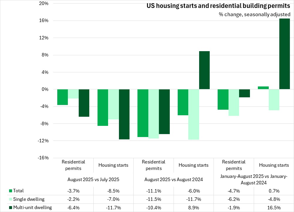 In the first eight months of 2025, US housing starts were up 0.7%, with declines in single unit starts (-4.8%) and increases in multi-unit starts (+16.5%).