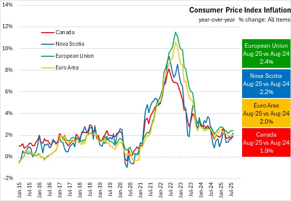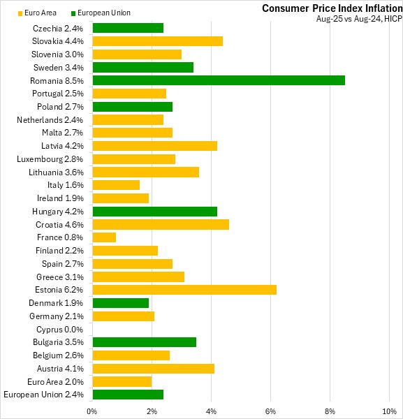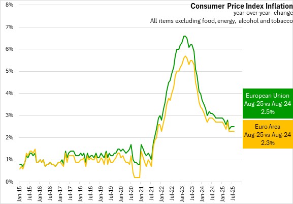 Excluding the impacts of energy, food, alcohol and tobacco prices year-over-year inflation was 2.5% in the European Union and 2.3% in the Euro Area in August 2025.