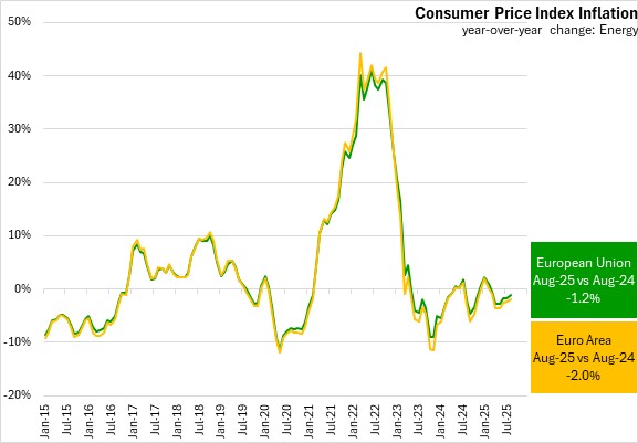 Energy price inflation was -1.2% in the European Union and -2.0% in the Euro Area in August 2025.