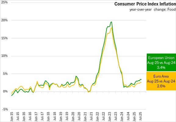 Food price inflation was 3.4% for the European Union and 2.6% in the Euro Area in August 2025.