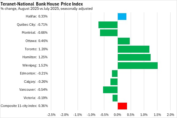 Halifax resale home prices, as measured by the Teranet-National Bank House Price Index (seasonally adjusted), rose slightly by 0.33% from July to August.