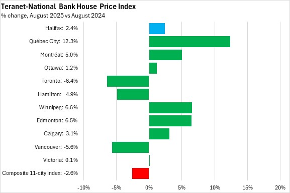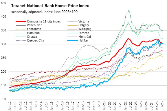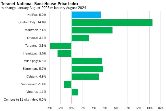 Halifax home prices were up 5.2% in the first eight months of 2025 when compared with the same period in 2024. The 11-city index in resale home prices was virtually unchanged from the first 8 months of 2024. Every city in the index except Toronto, Hamilton and Vancouver reported gains in home prices, with Québec City reporting the largest increase.