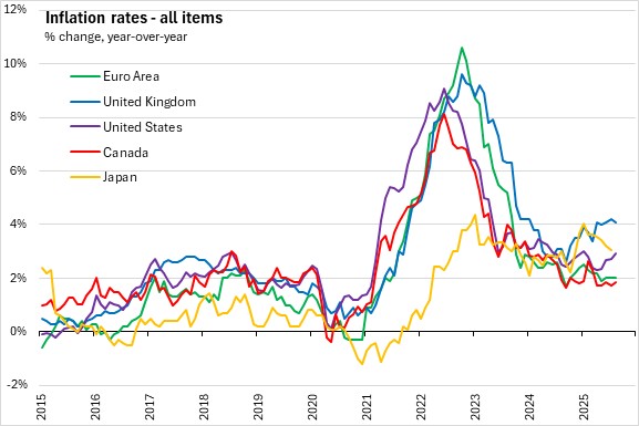 UK GDP has grown 0.3% in Q2 2025, stronger than expected in the August report. Household consumption had risen by 0.1%, while business investment had fallen by 4.0% and government expenditure had risen by 2.0%. UK export volume to the US had fallen by 27%, accounted for by weakness in vehicle and metal exports. Bank staff expected headline GDP to increase by around 0.4% in 2025 Q3, slightly stronger than the underlying trend in growth.