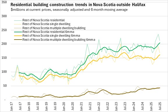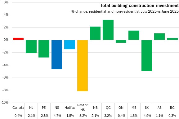 Investment in Nova Scotia building construction declined 4.7% in July 2025 to $586.1 million. Halifax monthly building construction was down 1.5% to $317.0 million while outside of Halifax building construction was down 8.2% to $269.1 million. Nationally, investment in building construction rose 0.4% with gains in four provinces. Québec reported the largest gain in building construction investment, while Saskatchewan had the steepest decline, followed by Nova Scotia.
