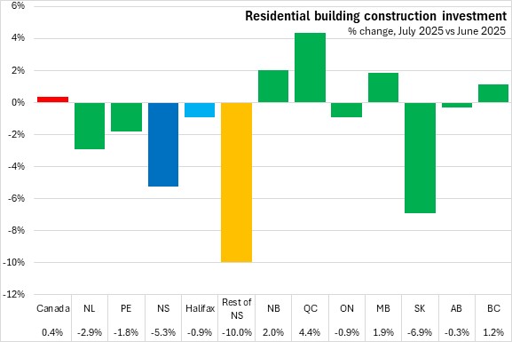 Nova Scotia's July 2025 residential construction investment fell 5.3% to $463.8 million. Halifax residential construction was declined 0.9% to $251.9 million. Outside of Halifax residential construction was down 10.0% to $211.9 million. National residential construction increased by 0.4%, with gains in four provinces. Québec had the largest gain while Saskatchewan reported the steepest decline, followed by Nova Scotia.