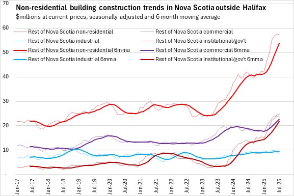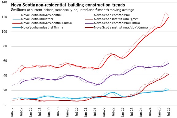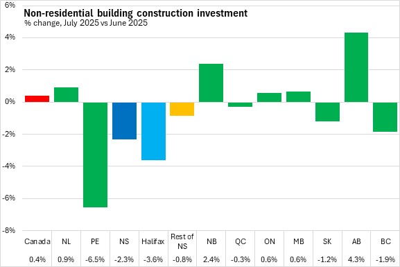 Nova Scotia's non-residential building construction declined 2.3% to $122.3 million. In Halifax, non-residential construction was down 3.6% to $65.1 million. Outside of Halifax, non-residential construction was down 0.8% to $57.2 million. National non-residential building construction was up 0.4% in July 2025 with increases in five provinces, led by Alberta. Prince Edward Island reported the largest decline, followed by Nova Scotia.
