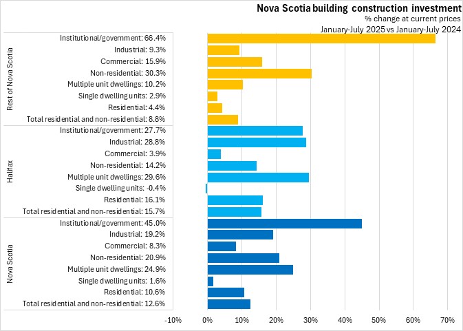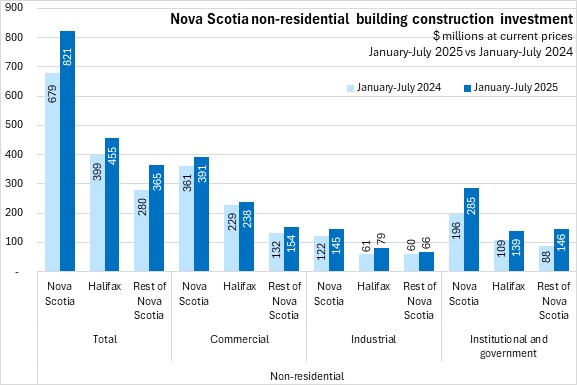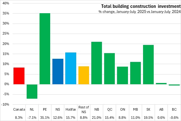 Nova Scotia's total building construction investment increased from $3,575 million in January-July 2024 to $4,025 million in January-July 2025. Residential investment as well as non-residential investment were up across the province.