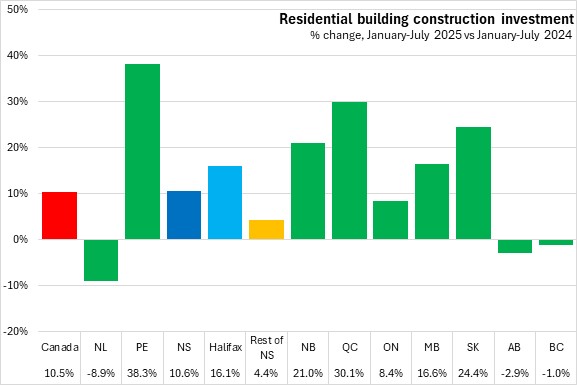 Residential construction investment was up 10.6% in Nova Scotia compared to January-July 2024. Halifax's residential construction was up 16.1% and outside of Halifax residential construction was up 4.4%. National residential construction was up 10.5% with gains in seven provinces. Prince Edward Island reported the fastest gain, while Newfoundland and Labrador experienced the steepest decline.