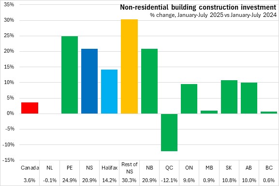 Nova Scotia's non-residential construction was up 20.9% compared to January-July 2024. Halifax's non-residential construction rose 14.2% while outside of Halifax, non-residential construction was up 30.3%. National non-residential construction investment increased 3.6% compared to January-July 2024. Eight provinces reported gains, led by Prince Edward Island. Québec reported the steepest decline.