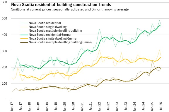 Nova Scotia residential building construction investment growth was driven by an increase in multiple dwelling building construction across the province, more than offsetting a slight decline in single dwelling building construction in Halifax.