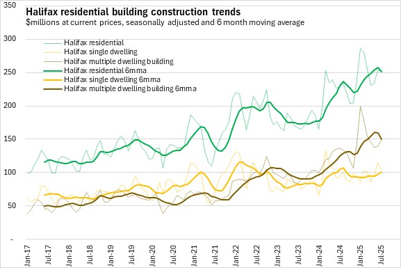In Halifax, residential construction investment had trended up for multi-unit dwellings since late 2024. However, single unit dwelling investments have peaked. Outside the city, investment in single dwelling unit construction is typically higher than for multi-unit structures. In Halifax, multiple dwelling unit buildings are a larger share of investment than single dwelling units.
