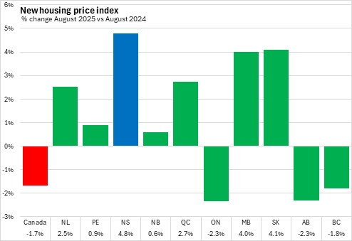 Nova Scotia’s new housing prices increased 4.8% from August 2024 to August 2025. Nationally, prices were down 1.7%.
