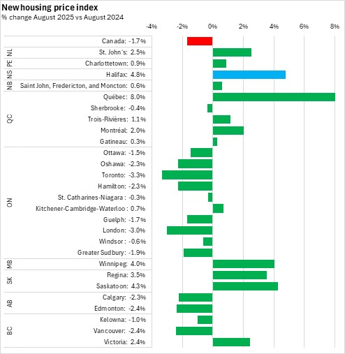 Halifax new home prices increased 4.8% year-over-year in August 2025. Among Census Metropolitan Areas, new housing prices were down year-over-year in fourteen cities, with Toronto and London reporting the largest declines. Québec City and Halifax reported the largest year-over-year gains.