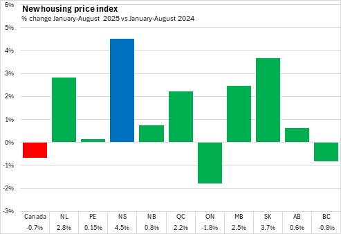 In the first eight months of 2025, Nova Scotia's new housing price index was 4.5% higher compared to the same period in 2024, the fastest increase among provinces. Nationally, new housing prices were down 0.7% year-to-date with gains in eight provinces. Year-to-date declines in new housing prices were reported in Ontario (fastest) and British Columbia.