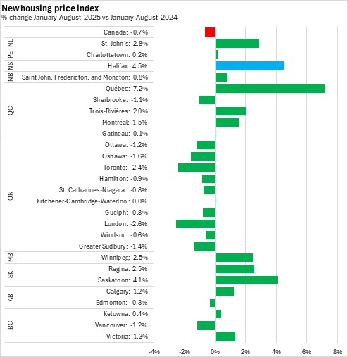 Halifax new housing prices were up 4.5% in January-August 2025 compared to January-August 2024. The fastest growth among CMAs was in Québec City and the fastest declines were in London and Toronto.